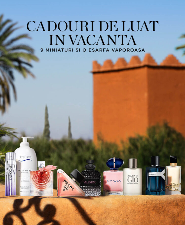 La achizitii de produse Lancôme, Prada, Valentino, Yves Saint Laurent, Armani sau Biotherm, in valoare de minimum 350 lei primesti 9 miniaturi si o esarfa.