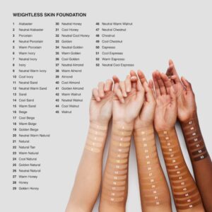 Fondul de ten Weightless Skin Foundation SPF 15 este formulat pentru a se simti ca o a doua piele. Formula sa usoara si matasoasa se aplica uniform, acoperind imperfectiunile si oferind un finisaj natural, care lasa pielea sa respire. Textura sa fluida permite o aplicare usoara si uniforma, fara sa lase urme sau senzatia de masca. Unul dintre punctele forte ale acestui fond de ten este protectia solara SPF 15, care ofera o bariera impotriva razelor UVA si UVB. Aceasta caracteristica il face ideal pentru utilizarea zilnica, protejand pielea de efectele nocive ale soarelui, in timp ce ofera o acoperire impecabila.