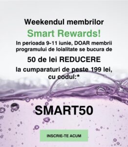 In perioada 9-11 iunie doar membrii programului de loialitate se bucura de 50 lei Reducere la cumparaturi de peste 199 lei cu codul SMART50. Inscrie-te acum ca sa beneficiezi de reducere.