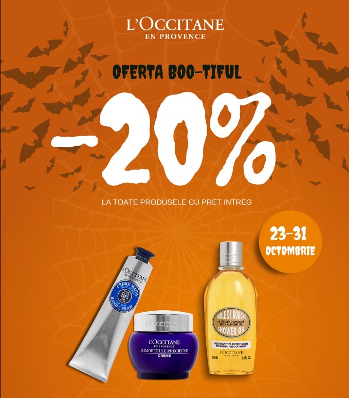 Oferta BOO-tiful: 20% DISCOUNT la toate produsele L’Occitane cu pret intreg , in perioada 23- 31 octombrie! No tricks, just treats.Discountul se aplica automat.