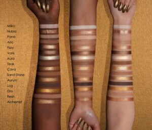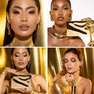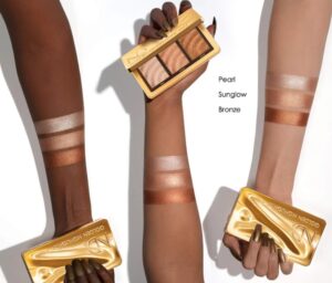 Paleta Golden Highlighter de la Natasha Denona contine iluminatoare extrem de moi, cu o formula hibrida între pudra umeda, in trei nuante – Pearl, Glow si Bronze – care se potrivesc tuturor tonurilor de piele. Aceasta pudra-gel se aplica cu usurinta pe piele, oferind o acoperire medie pana la ridicata, lasand un finisaj lichid, asemanator metalului. Formulate cu ingrediente active derivate din acid hialuronic, aceste iluminatoare ajuta la hidratarea pielii, oferind o senzatie catifelata, poate fi aplicata pe obraji, ochi si buze.