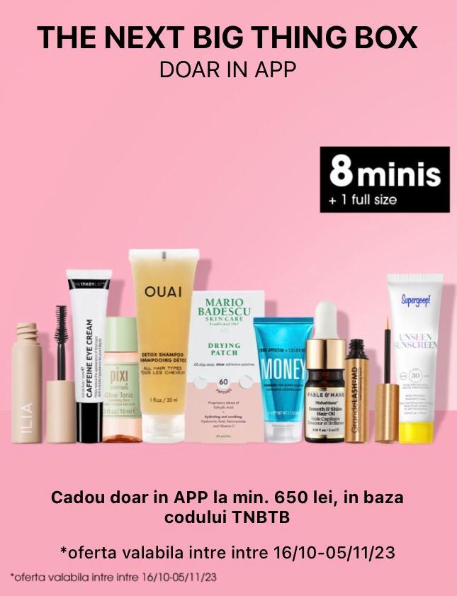 Sephora ofera cadou 8 mini produse plus unul full size atunci cand faci o comanda in app de minim 650 lei folosind codul TNBTB.